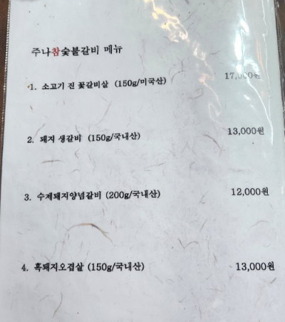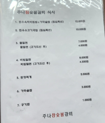 주나 참숯불갈비 메뉴는 위 사진과 같습니다.